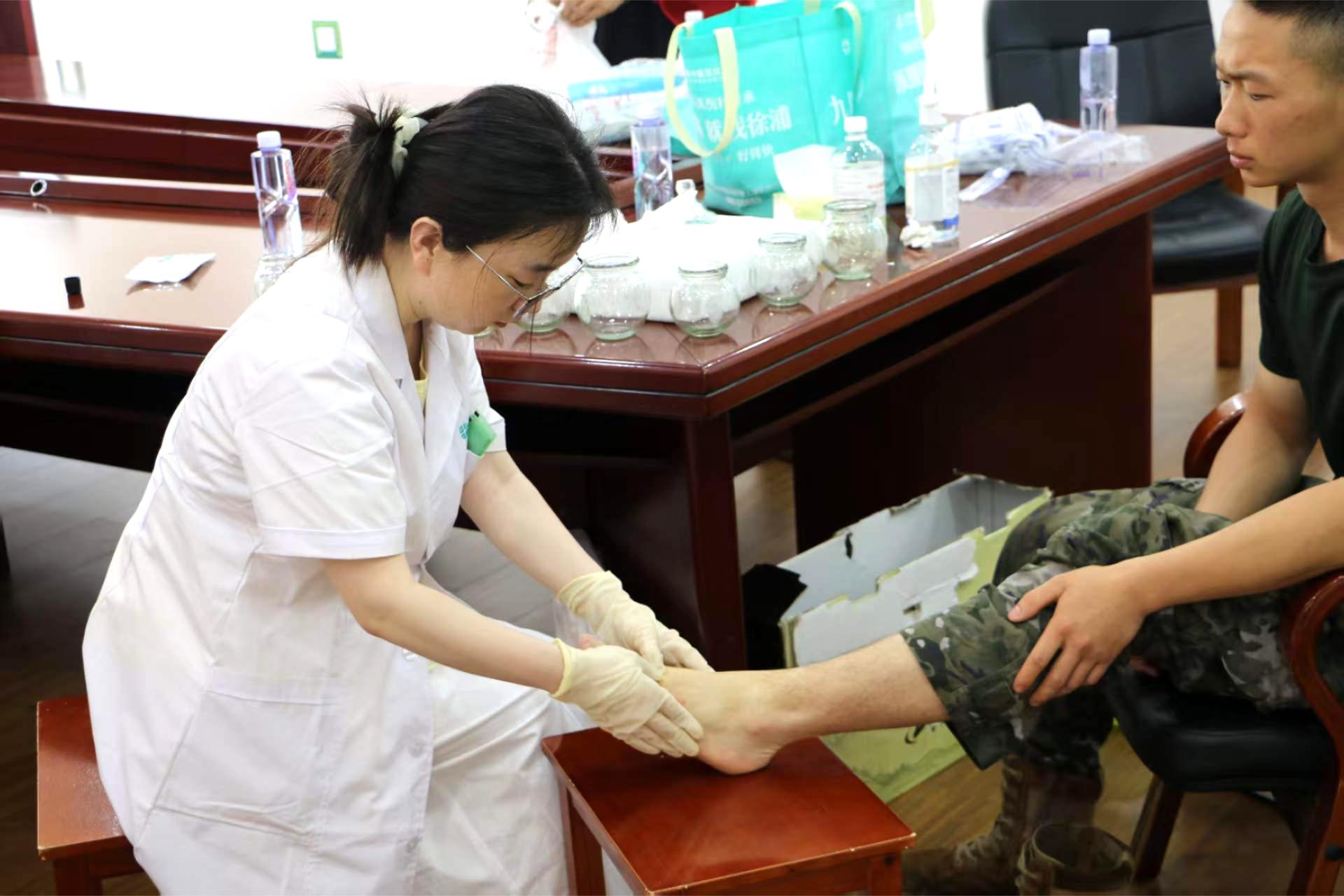 上海徐浦中医医院中医内科医师为官兵们把脉问诊、辩证问诊,并现场提供拔罐、刮痧等中医特色服务,为官兵们舒筋活络,调理身体,讲解相关日常锻炼和保健知识。