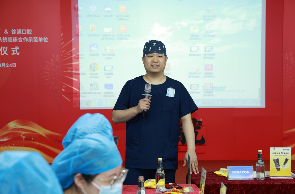 BAZON中国区总经理首先登台致辞,他表示,BAZON百赞作为源自德国慕尼黑的口腔种植品牌,始终以“精密制造,适配亚洲”为核心愿景,此次与“徐浦口腔”建立临床合作示范单位,是品牌深耕中国市场、推动本土化诊疗升级的重要一步。“我们期待通过徐浦口腔的临床实践,将BAZON的技术优势转化为实实在在的患者福祉,共同打造口腔种植领域的合作标杆。”